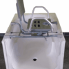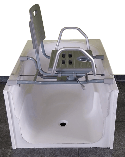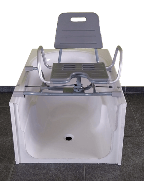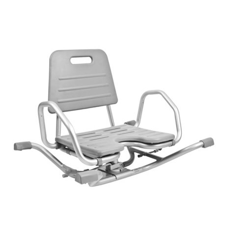 Snurrbar badkarssstol med hygienutskärning. Silverfärgad aluminiumram. Sits och ryggstöd är tillverkade av mjuk grå PU. Ryggstödet och armstöden är fästa med klämmor och är lätta att ta bort.