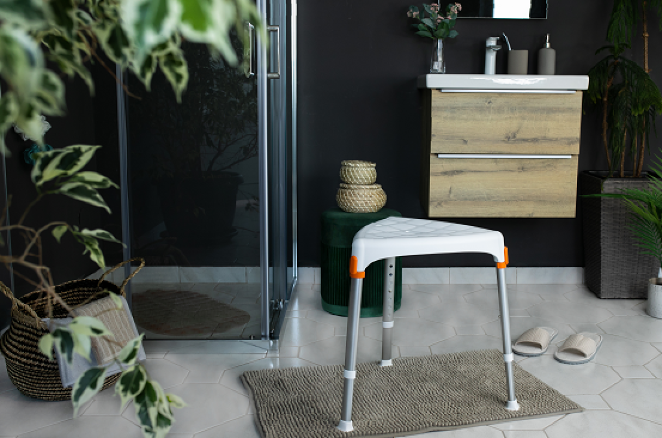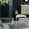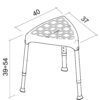 Trekantig duschpall som passar till hörn eller fritt i duschutrymmet. Ram i lätt aluminium, höjdjusterbar 39-54 cm. Ben försedda med antiglid doppskor. Sits 47 cm x 37 cm. Max brukarvikt 150 kg.