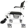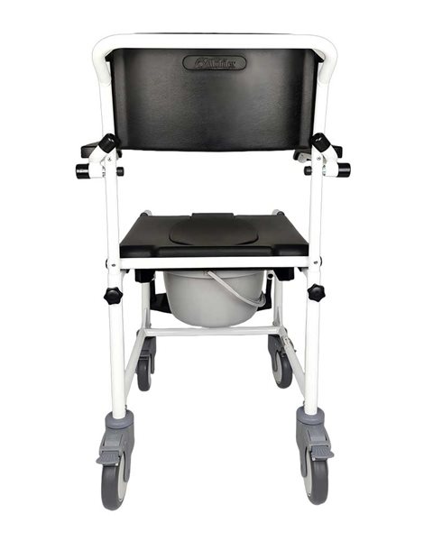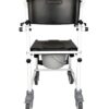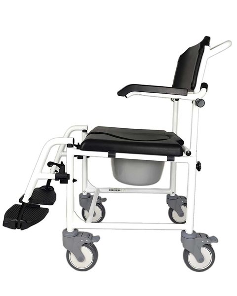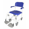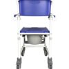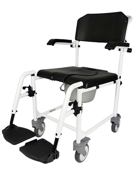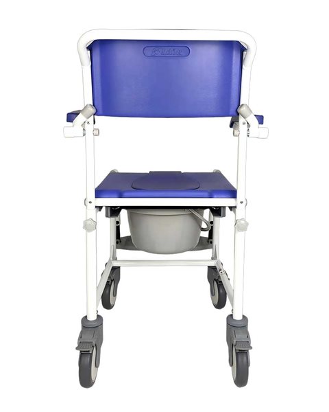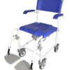 Toalett- och duschstol i vit, pulverlackerad stomme. Stolen har fyra 5″ låsbara hjul. Sits, ryggstöd och fällbara armstöd är klädda med mjuk, blå PU, vilket garanterar god sittkomfort. Fotstöden är höjdjusterbara och kan enkelt tas bort. Stolen levereras med toaletthink och lock.