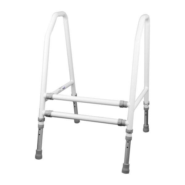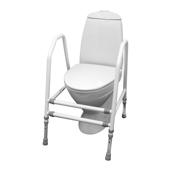 Fristående toalettstöd är avsedd för personer som behöver stöd när de reser sig upp eller sätter sig ner. Ramen är tillverkad av aluminiumrör som gör den korrosionsbeständig, inklusive de höjdjusterbara benen. Stödet kan justeras i bredd och höjd för att passa de flesta toaletter och kräver ingen installation eller verktyg och är enkelt att justera med hjälp av klämmor.